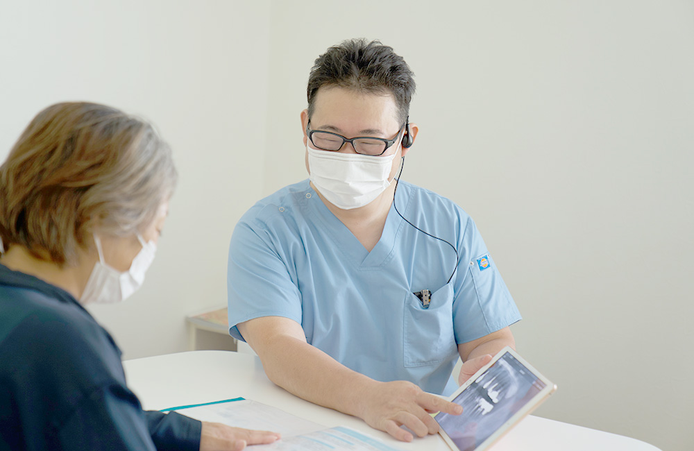 まずは患者様のお困りごとを早急に解消するための応急的な処置を行います。レントゲン等を用いて、現状についても専門知識のあるスタッフがご説明差し上げます。