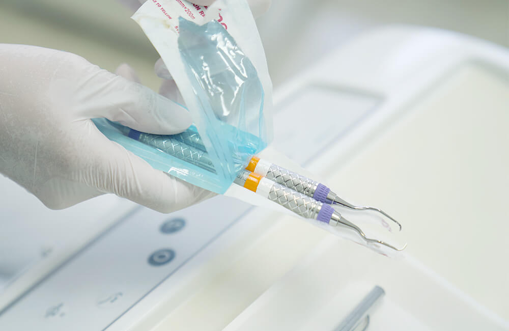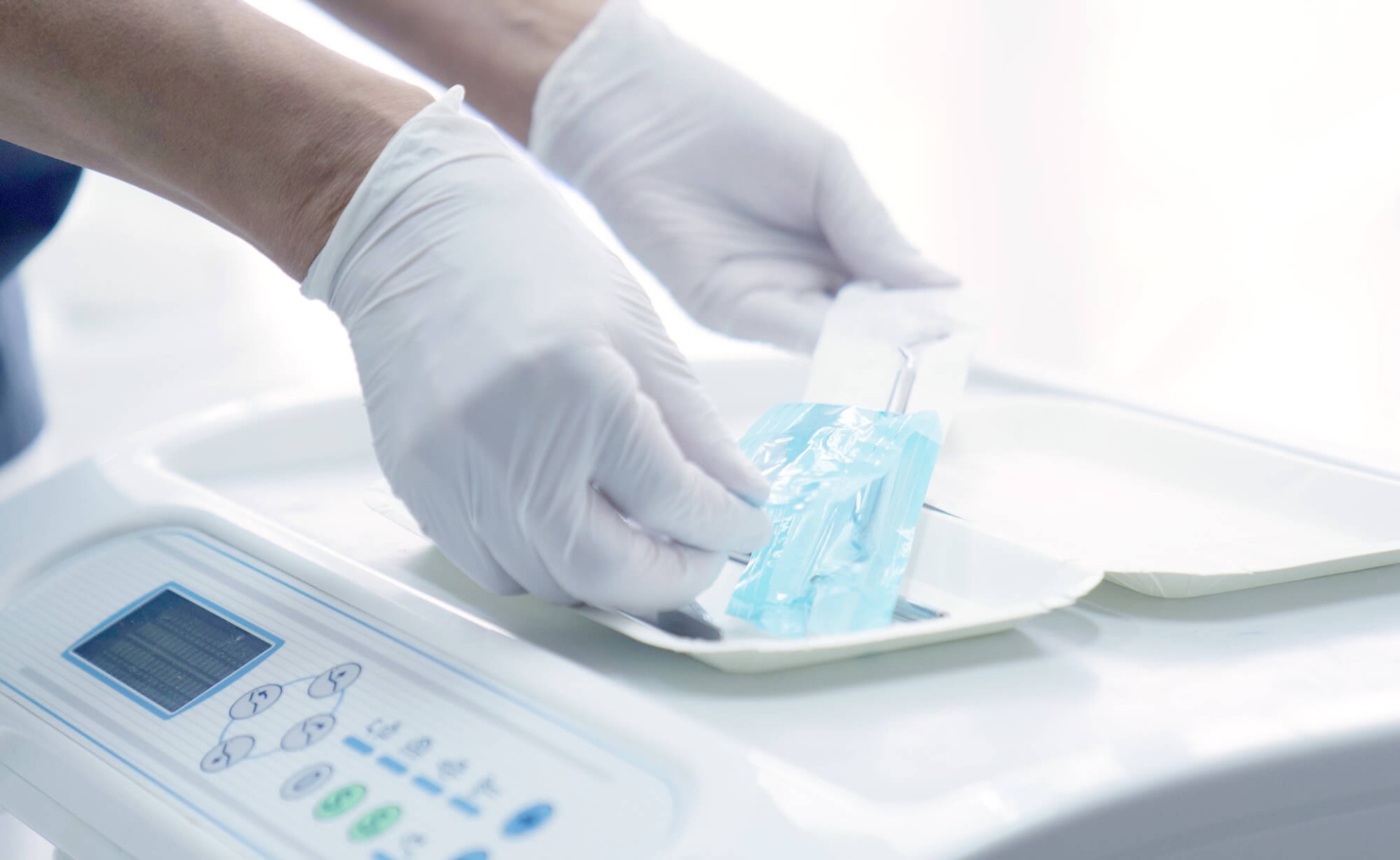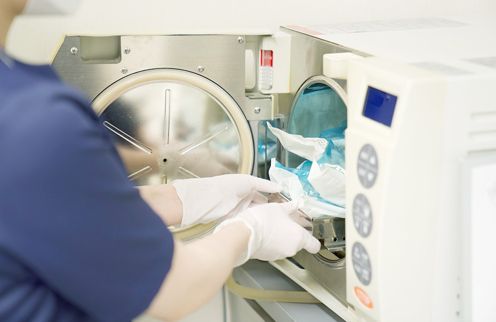ゴム手袋、患者さま用のコップ・エプロン等は、使い捨てのものを使用し、使い捨ての出来ない医療器具などは、特殊な機械を使用して減菌を行っています。