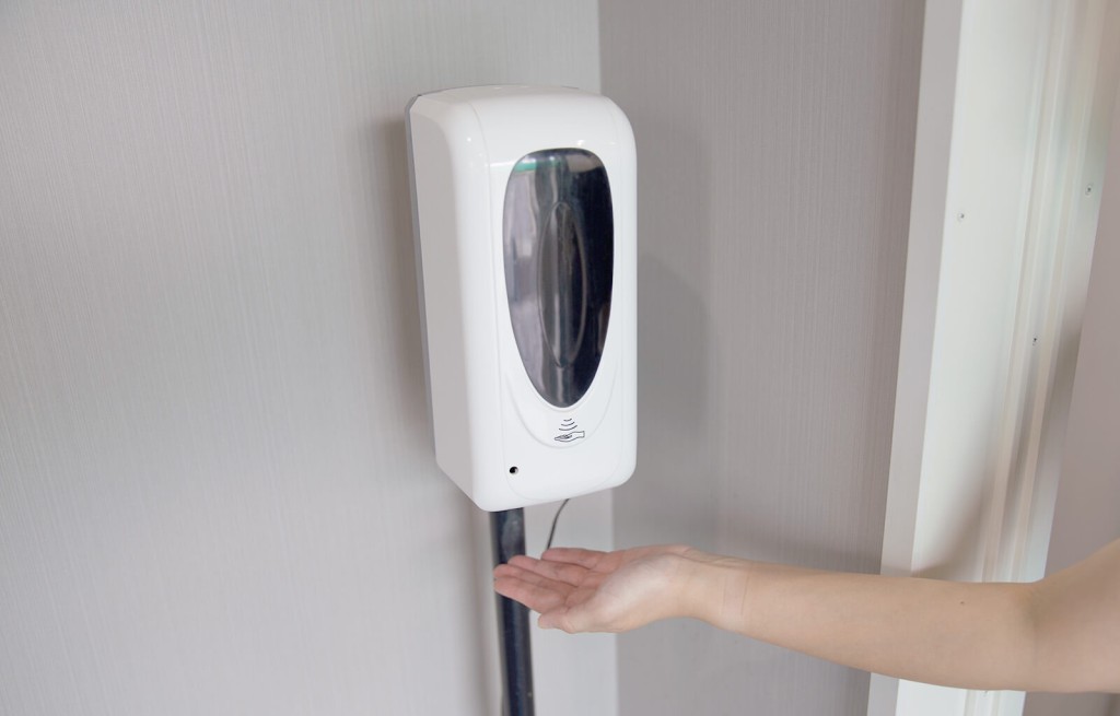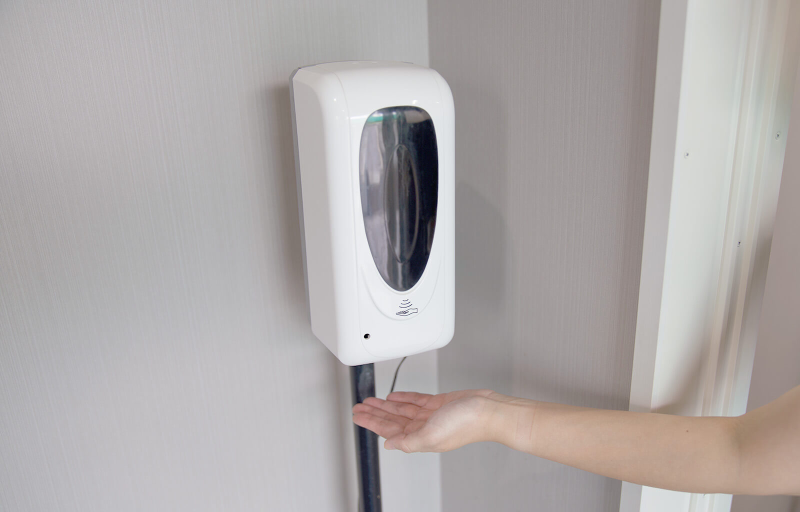 受付に非接触式の消毒液を設置しておりますので、手指消毒をお願いします。